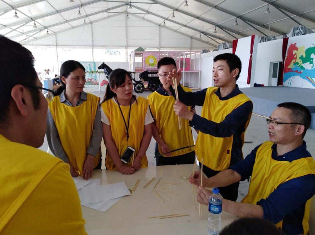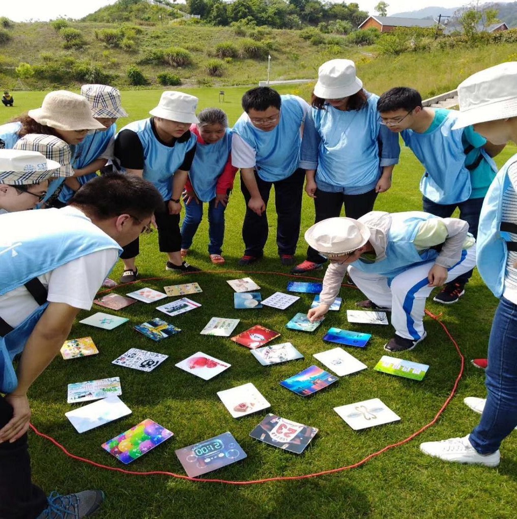 兩個半小時的車程后,我們抵達了山清水秀的千島湖。天公作美,此時陰雨散去,已是陽光明媚,溫度宜人。飽餐一頓之后,我們便驅(qū)車前往第一個活動地點——千島湖馬術(shù)公園拓展基地,開始了我們的團隊建設(shè)活動。首先,我們分成兩隊進行了團隊建設(shè),每隊選出了一名隊長,設(shè)計確定了隊名、隊徽、口號,并一起制作了各自的隊旗,最后進行團隊展示。通過這項熱身,團隊成員開始相互熟悉,氛圍也很快變得活躍了起來。隨后,我們開始了第一項活動——數(shù)字游戲。在40分鐘內(nèi),我們要破解出30張卡片上的數(shù)字提示,并在一分鐘內(nèi)派一個人將30張卡片按順序交給裁判,每隊有3次機會。在游戲中,大家積極動腦,為團隊榮譽獻計獻策,最終一隊順利完成了任務(wù),而另一隊離成功也只差一點點,游戲過程中充分展示了團隊成員間的默契與合作能力,大家也都從中學到了團隊配合的重要性。