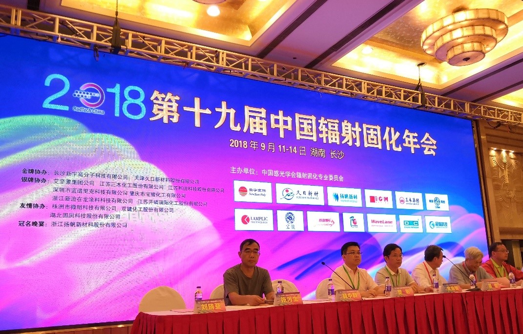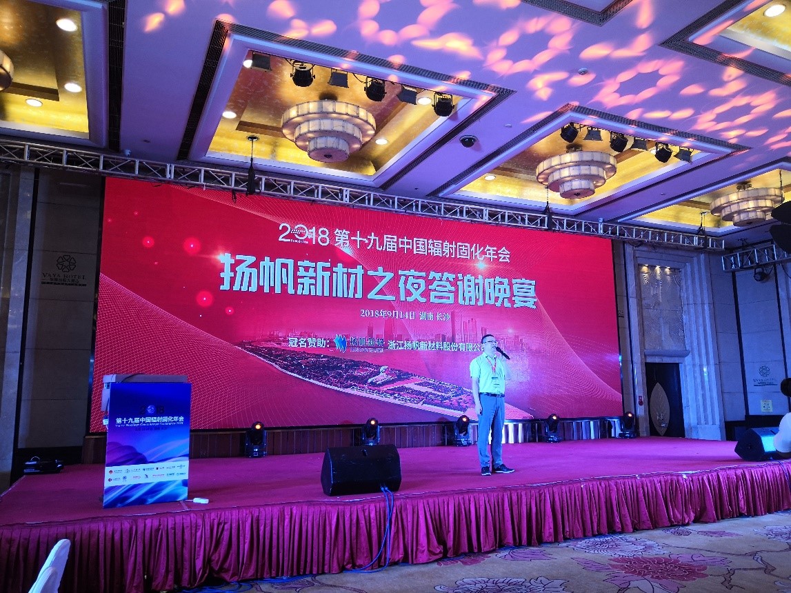 2018年9月11日,第十九屆中國輻射固化年會在長沙召開。揚帆新材董事長樊彬、總裁李耀土以及副總裁朱俊飛、技術(shù)總監(jiān)吳紅輝等出席會議。