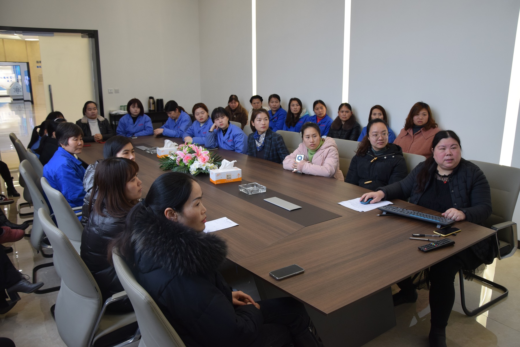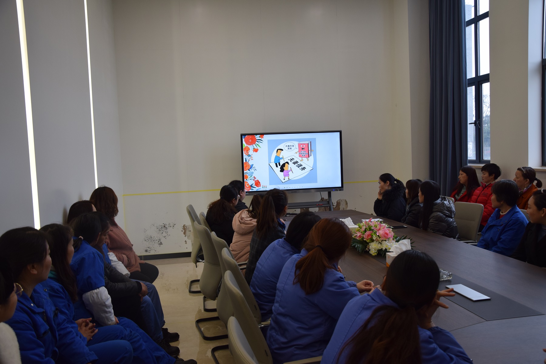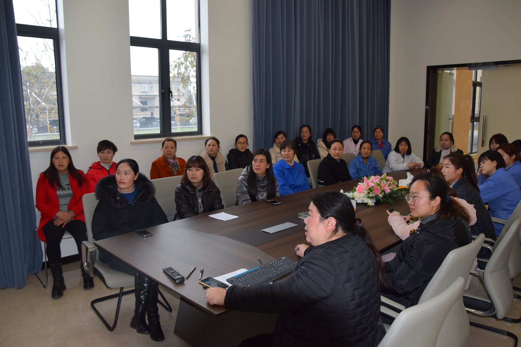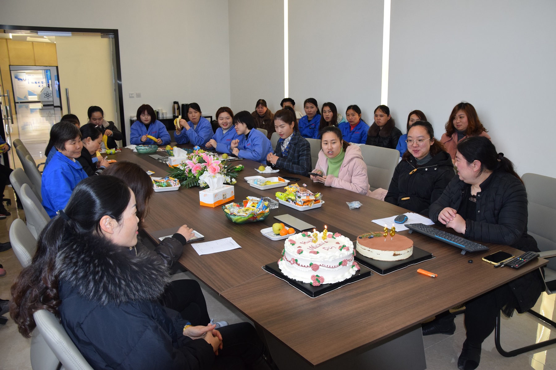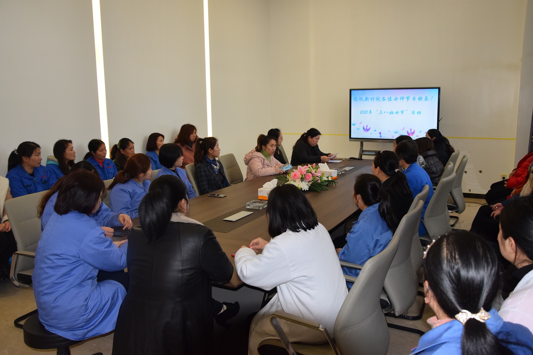 上虞生產基地工會組織全體女職工在研發大樓會議室歡聚一堂。