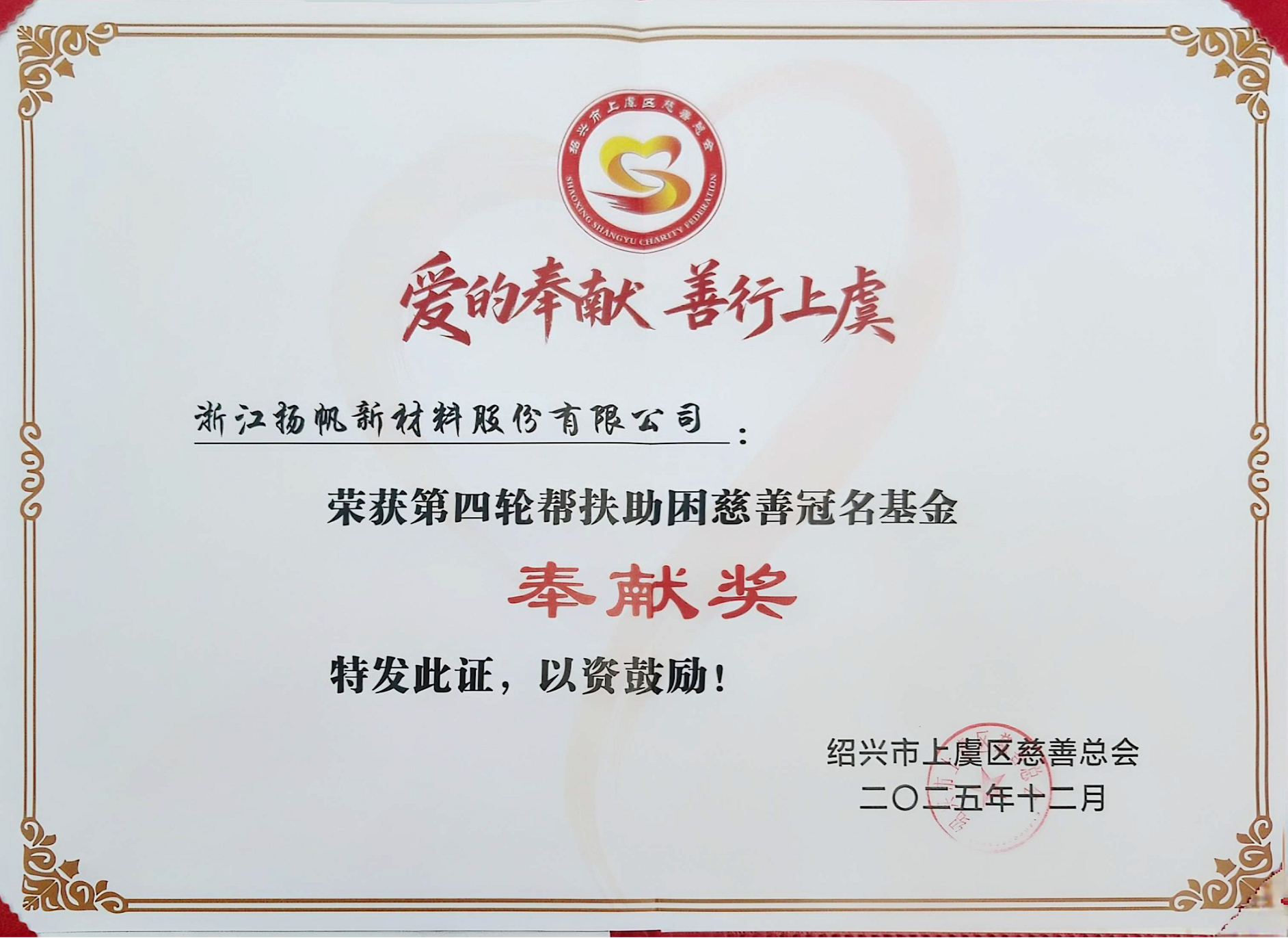 揚帆新材料(浙江)股份有限公司憑借長期以來對慈善事業(yè)的堅守與無私奉獻,成功收獲慈善奉獻獎。自2006年上虞區(qū)慈善總會啟動第一輪慈善冠名基金以來,公司扎根上虞,心懷責任,多年來持續(xù)認捐慈善冠名基金,將公益慈善作為企業(yè)發(fā)展的重要使命。這份榮譽,是對企業(yè)踐行社會責任的高度肯定,更是對揚帆企業(yè)初心的最好見證。